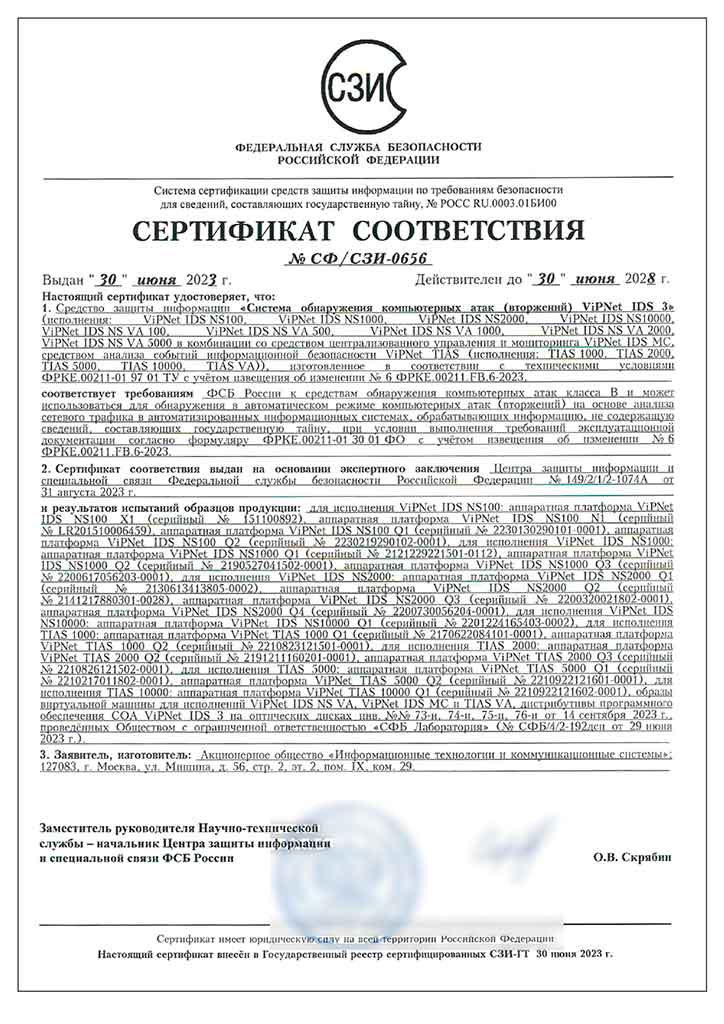 Настоящий сертификат удостоверяет что «Система обнаружения компьютерных атак (вторжений) ViPNet IDS 3» является системой обнаружения вторжений, соответствует требованиям по безопасности информации, установленным в документах «Требования по безопасности информации, устанавливающие уровни доверия к средствам технической защиты информации и средствам обеспечения безопасности информационных технологий» (ФСТЭК России, 2020)» - по 4 уровню доверия, «Требования к системам обнаружения вторжений» (ФСТЭК России, 2011) и «Профиль защиты систем обнаружения вторжений уровня сети четвертого класса защиты. ИТ.СОВ.С4.ПЗ» (ФСТЭК России, 2012).