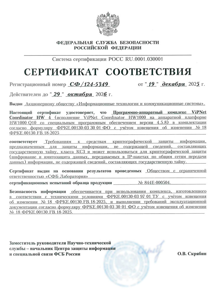 Сертификат соответствия ФСБ России № СФ/124-4929 от 01.06.2024 удостоверяет, что «Программно-аппаратный комплекс ViPNet Coordinator HW 4» (исполнения на аппаратных платформах HW50 N1, HW50 N2, HW50 N3, HW50 N4; HW100 N1, HW100 N2, HW100 N3; HW1000 Q4, HW1000 Q5, HW1000 Q6, HW1000 Q7, HW1000 Q8, HW1000 Q9; HW2000 Q4, HW2000 Q5; HW5000 Q1, HW5000 Q2) соответствует Требованиям к средствам криптографической защиты информации класса КС3.