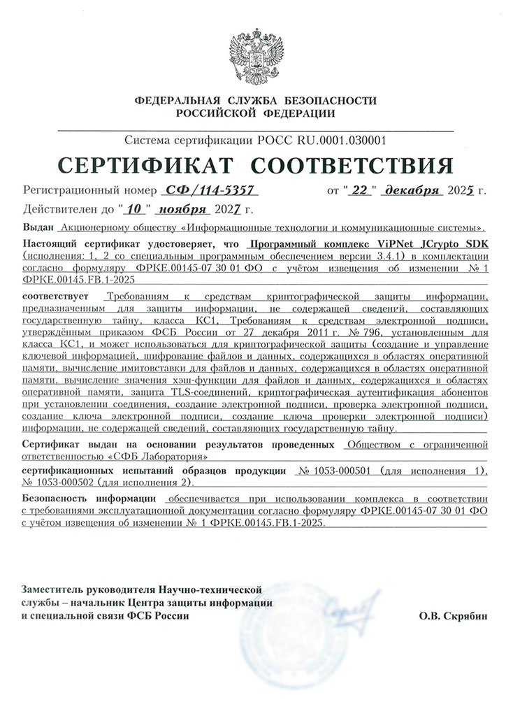 Провайдер криптографических функций (криптопровайдер) ViPNet JCrypto SDK — это средство криптографической защиты информации, предназначенное для выполнения криптографических операций, доступ к которым обеспечивается встраиванием в приложения, работающие в Java-машинах ART (ОС Android) и Oracle JRE (ОС Windows, Linux, macOS), через стандартизованный интерфейс JCA.
