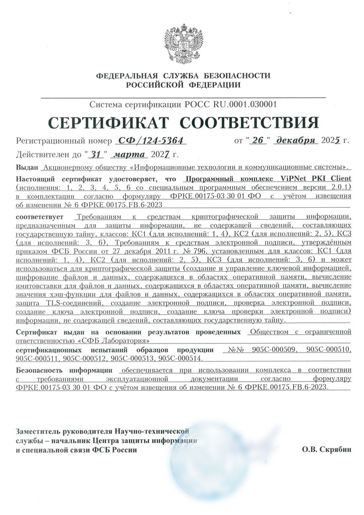 Сертификат ФСБ России № СФ/124-5364 от 26.12.2025 г. подтверждает, что программный комплекс ViPNet PKI Client (исполнения 1-6) соответствует требованиям к СКЗИ классов КС1, КС2 и КС3 и требованиям к средствам электронной подписи классов КС1, КС2 и КС3.