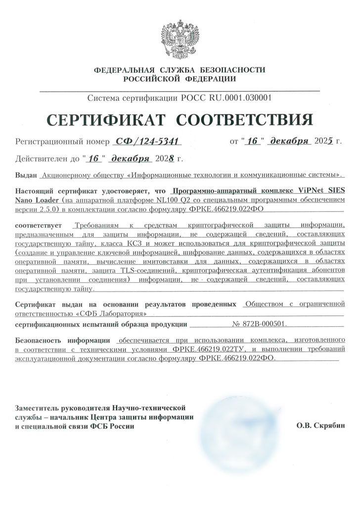 Сертификат удостоверяет, что программно-аппаратный комплекс ViPNet SIES Nano Loader (на АП NL100 Q2 со специальным программным обеспечением версии 2.5.0) соответствует требованиям ФСБ России к СКЗИ класса КС3.