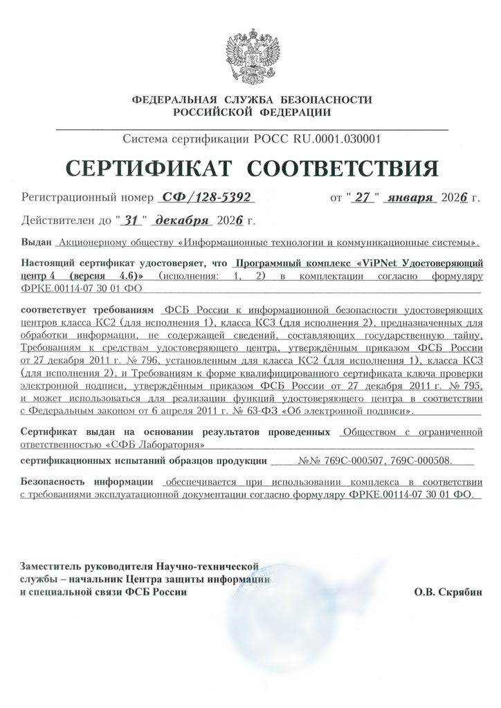 Сертификат соответствия ФСБ России №СФ/128-5392 от 27.01.2026 удостоверяет, что программный комплекс "ViPNet Удостоверяющий центр 4 (версия 4.6)" в исполнениях 1 и 2 соответствует требованиям ФСБ России к информационной безопасности УЦ класса КС2 (для исполнения 1), класса КС3 (для исполнения 2), а также требованиям к средствам УЦ, утвержденным приказом ФСБ России от 27.12.2011 №796, установленным для класса КС2 (для исполнения 1) и класса КС3 (для исполнения 2), и требованиям к форме квалифицированного сертификата ключа проверки электронной подписи, утвержденным приказом ФСБ России от 27.12.2011 №795.