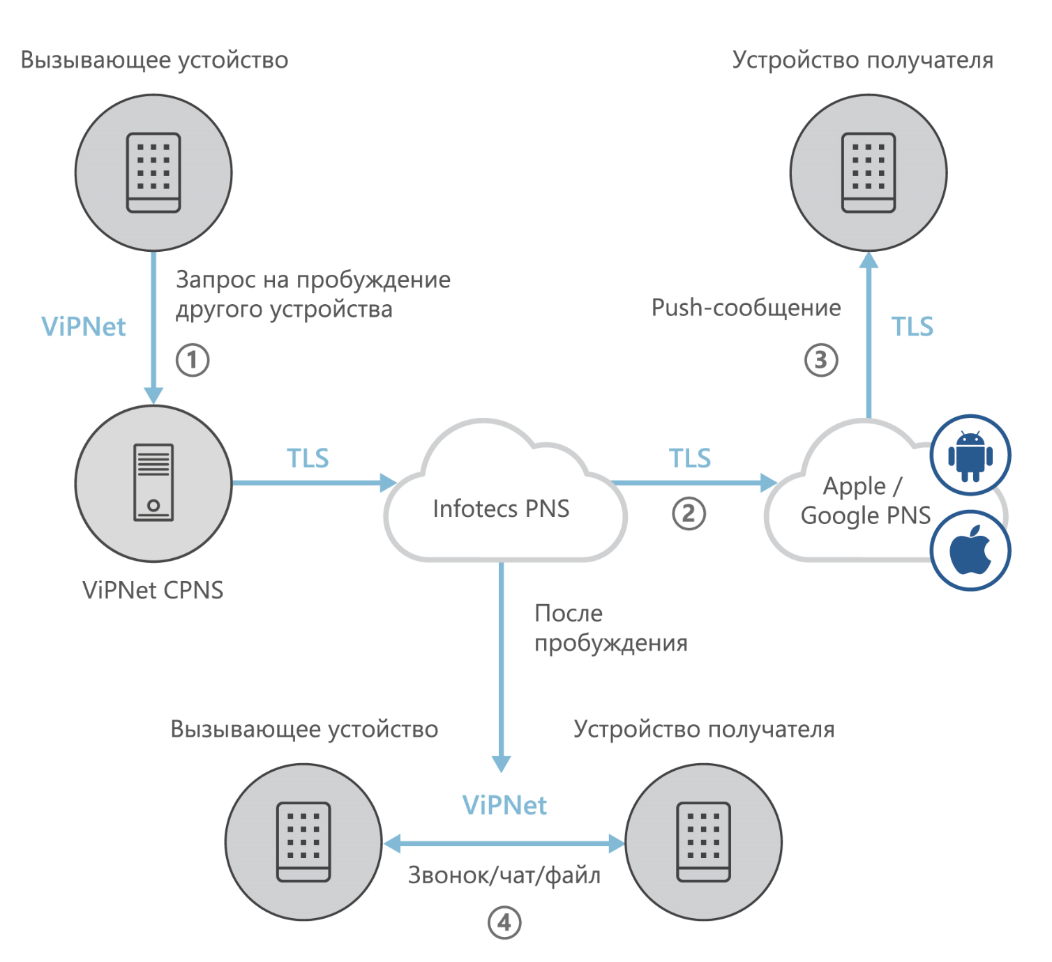 Чтобы пользователи мобильных устройств, находящихся в спящем режиме, могли своевременно получать сообщения и звонки, используются push-уведомления, отправляемые сервером ViPNet CPNS. Данный сервер позволяет скрыть реальные IP-адреса пользователей и структуру защищенной сети заказчика.