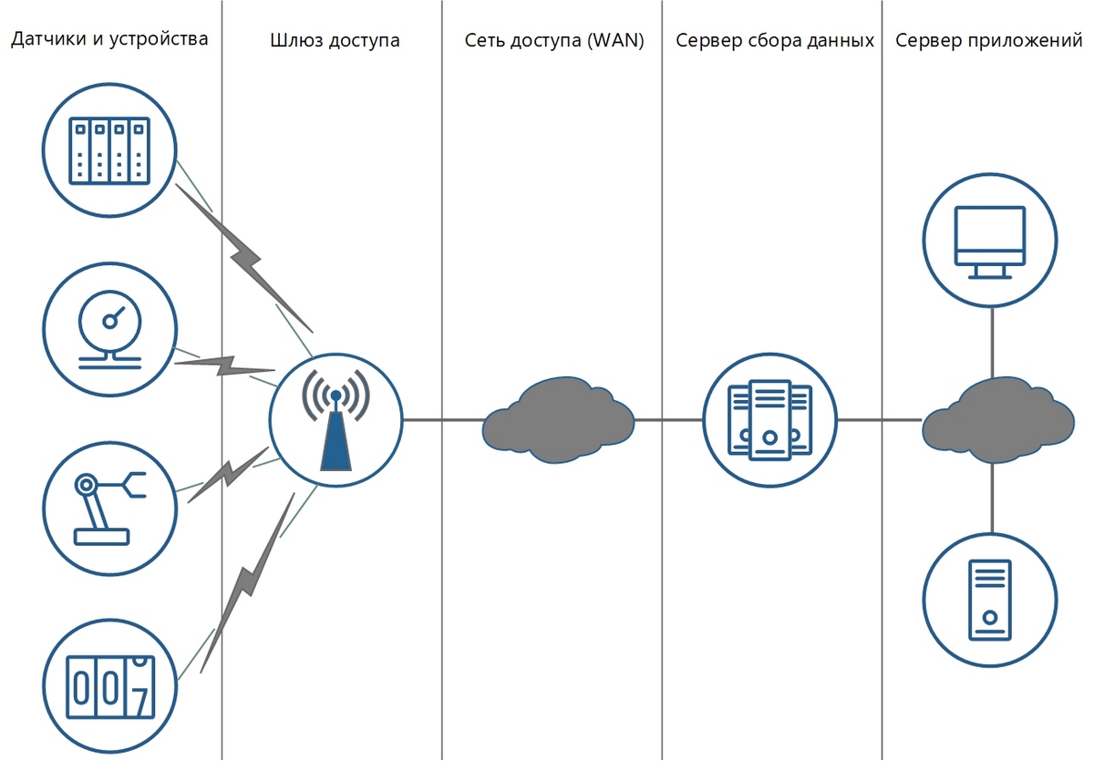 Одной из технологий, применяемых для обмена данными между устройствами IIoT, является LPWAN (Low-Power Wide-Area Network) – класс беспроводных технологий передачи небольших по объему данных на дальние расстояния. LPWAN включает в себя множество стандартов, самые распространенные из них – NB-IoT, Sigfox, LoRaWAN.