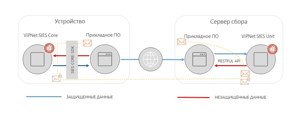 - перед отправкой данных ограниченного доступа получателю защищаемое устройство вызывает функцию шифрования данных в криптографическом контексте из состава ViPNet SIES Core SDK.